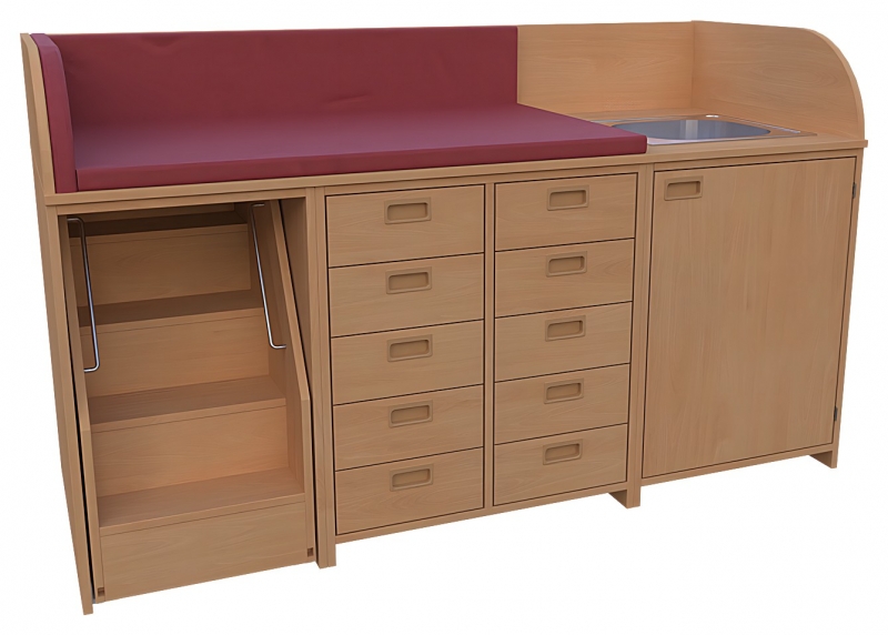Wickelkommode, BxHxT 185 x 85 / 110 x 75 cmoben: 3-seitige Aufkantung für Wickelauflage- Kunstleder Wickelauflage nicht im Lieferumfang enthaltenrechts: 1 Waschbecken, 1 Tür, 1 Einlegebodenmitte: offen, Mittelwand, 2 x 5 Schubkästen, Muschelgriffe, SoftClose Auszügelinks: 1 ausfahrbare Treppe mit Feststellstop