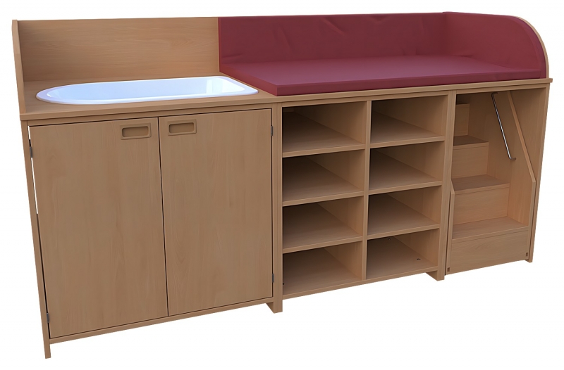 Wickelkommode, BxHxT 210 x 85 / 110 x 75 cmoben: 3-seitige Aufkantung für Wickelauflage- Kunstleder Wickelauflage nicht im Lieferumfang enthaltenlinks: 1 VARICOR Badebecken, 2 Türen, Muschelgriffe, 1 Einlegebodenmitte: offen, MIttelwand, 2 x 3 verstellbare Einlegebödenrechts: 1 ausfahrbare Treppe mit Feststellstop