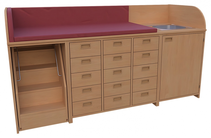 Wickelkommode, BxHxT 210 x 85 / 110 x 75 cmoben: 3-seitige Aufkantung für Wickelauflage- Kunstleder Wickelauflage nicht im Lieferumfang enthaltenrechts: 1 Waschbecken, 1 Tür, 1 Einlegebodenmitte: offen, 2 Trennwände, 3 x 5 Schubkästen,Muschelgriffe, SoftClose Auszügelinks: 1 ausfahrbare Treppe mit Feststellstop