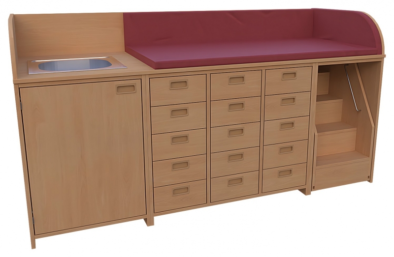 Wickelkommode, BxHxT 210 x 85 / 110 x 75 cmoben: 3-seitige Aufkantung für Wickelauflage- Kunstleder Wickelauflage nicht im Lieferumfang enthaltenlinks: 1 Waschbecken, 1 Tür, 1 Einlegebodenmitte: offen, 2 Trennwände, 3 x 5 Schubkästen,Muschelgriffe, SoftClose Auszügerechts: 1 ausfahrbare Treppe mit Feststellstop