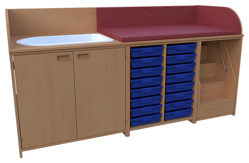 Wickelkommode, BxHxT 210 x 85 / 110 x 75 cmoben: 3-seitige Aufkantung für Wickelauflage- Kunstleder Wickelauflage nicht im Lieferumfang enthaltenlinks: 1 VARICOR Badebecken, 2 Türen, Muschelgriffe, 1 Einlegebodenmitte: offen, Mittelwand, 2 x 8 flachen Kunststoffkästenauf Kunststoffschienen laufend rechts: 1 ausfahrbare Treppe mit Feststellstop