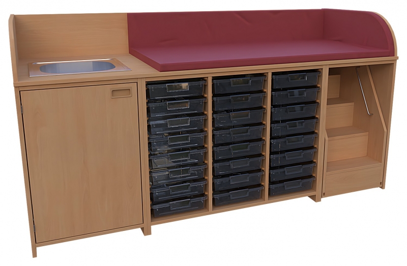 Wickelkommode, BxHxT 210 x 85 / 110 x 75 cmoben: 3-seitige Aufkantung für Wickelauflage- Kunstleder Wickelauflage nicht im Lieferumfang enthaltenlinks: 1 Waschbecken, 1 Tür, 1 Einlegebodenmitte: offen, 2 Trennwände, 3 x 8 flachen Kunststoffkästenauf Kunststoffschienen laufend rechts: 1 ausfahrbare Treppe mit Feststellstop