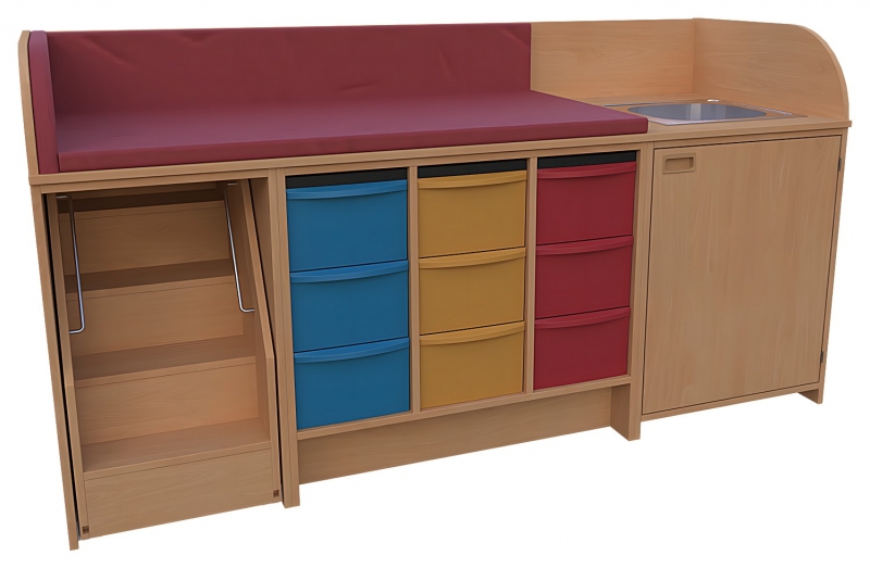 Wickelkommode, BxHxT 210 x 85 / 110 x 75 cmoben: 3-seitige Aufkantung für Wickelauflage- Kunstleder Wickelauflage nicht im Lieferumfang enthaltenrechts: 1 Waschbecken, 1 Tür, 1 Einlegebodenmitte: offen, 2 Trennwände, 3 x 3 hohe Modulboxenlinks: 1 ausfahrbare Treppe mit Feststellstop