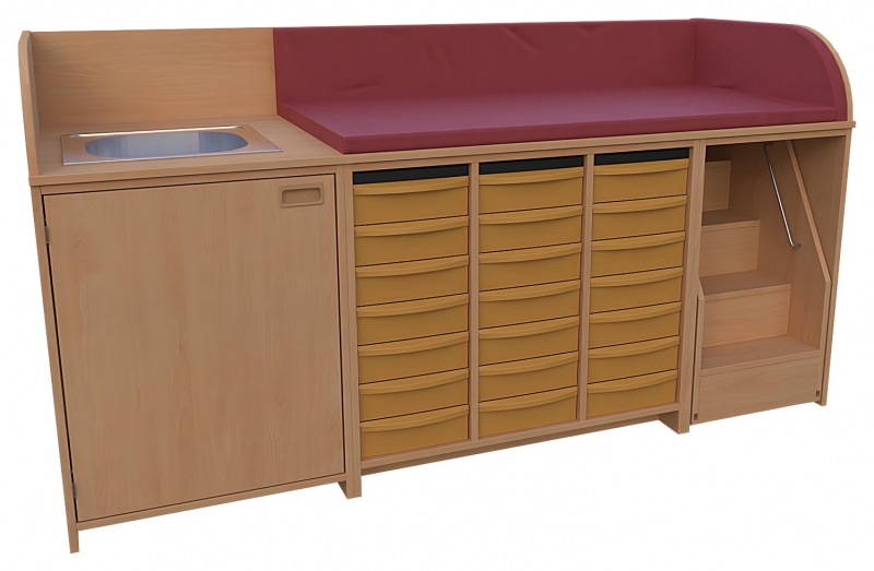 Wickelkommode, BxHxT 210 x 85 / 110 x 75 cmoben: 3-seitige Aufkantung für Wickelauflage- Kunstleder Wickelauflage nicht im Lieferumfang enthaltenlinks:: 1 Waschbecken, 1 Tür, Muschelgrff, 1 Einlegebodenmitte: offen, 2 Trennwände, 3 x 7 flache Modulboxenrechts: 1 ausfahrbare Treppe mit Feststellstop