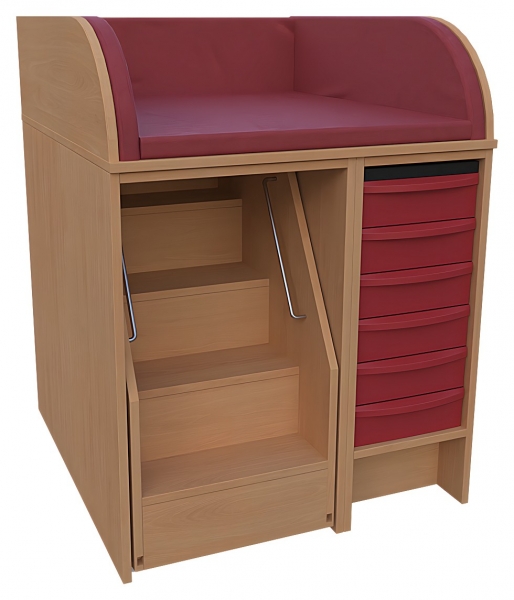 Wickelkommode, BxHxT 83 x 85 / 110 x 90 cmKorpus: 75 cm tief + Seitenteileoben: 3-seitige Aufkantung für Wickelauflage- Kunstleder Wickelauflage nicht im Lieferumfang enthaltenrechts: 6 flache Modulboxenlinks: 1 ausfahrbare Treppe mit Feststellstop