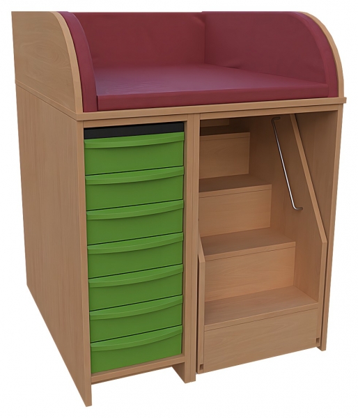 Wickelkommode, BxHxT 83 x 85 / 110 x 90 cmKorpus: 75 cm tief + Seitenteileoben: 3-seitige Aufkantung für Wickelauflage- Kunstleder Wickelauflage nicht im Lieferumfang enthaltenlinks: 7 flache Modulboxenrechts: 1 ausfahrbare Treppe mit Feststellstop