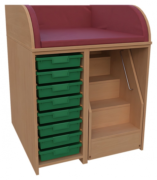Wickelkommode, BxHxT 86 x 85 / 110 x 90 cmKorpus: 75 cm tief + Seitenteileoben: 3-seitige Aufkantung für Wickelauflage- Kunstleder Wickelauflage nicht im Lieferumfang enthaltenlinks: offen, 8 flache Kunststoffkästenauf Kunststoffschienen laufendrechts: 1 ausfahrbare Treppe mit Feststellstop