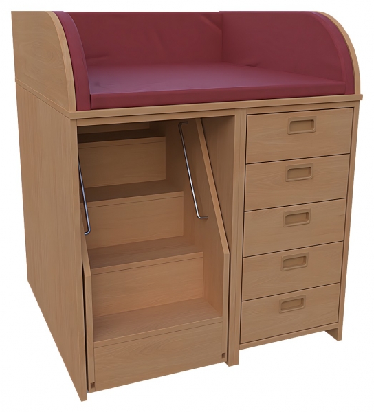 Wickelkommode, BxHxT 92 x 85 / 110 x 90 cmKorpus: 75 cm tief + Seitenteileoben: 3-seitige Aufkantung für Wickelauflage- Kunstleder Wickelauflage nicht im Lieferumfang enthaltenrechts: 5 Schubkästen, Muschelgriffe, SoftClose Auszügelinks: 1 ausfahrbare Treppe mit Feststellstop