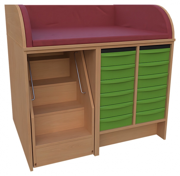 Wickelkommode, BxHxT 114 x 85 / 110 x 90 cmKorpus: 75 cm tief + Seitenteileoben: 3-seitige Aufkantung für Wickelauflage- Kunstleder Wickelauflage nicht im Lieferumfang enthaltenrechts: offen,Mittelwand,2 x 6 flachen Modulboxenlinks: 1 ausfahrbare Treppe mit Feststellstop