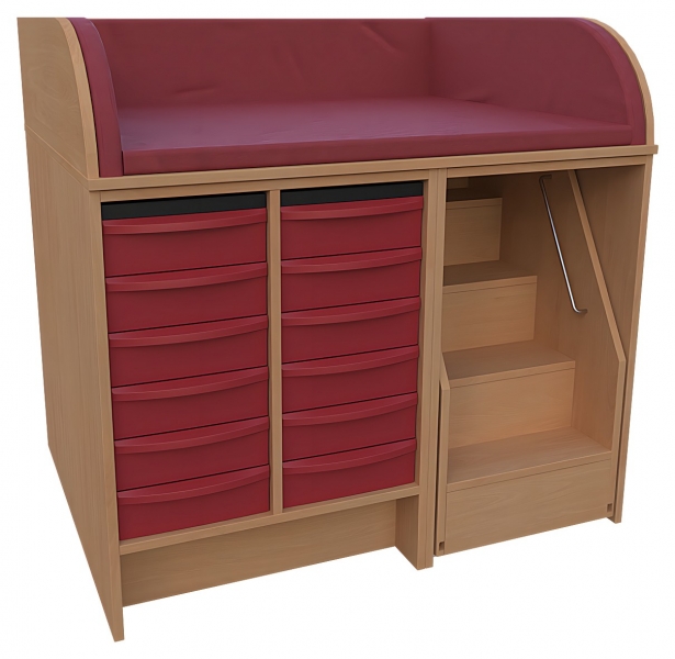 Wickelkommode, BxHxT 114 x 85 / 110 x 90 cmKorpus: 75 cm tief + Seitenteileoben: 3-seitige Aufkantung für Wickelauflage- Kunstleder Wickelauflage nicht im Lieferumfang enthaltenlinks: offen,Mittelwand,2 x 6 flachen Modulboxenrechts: 1 ausfahrbare Treppe mit Feststellstop