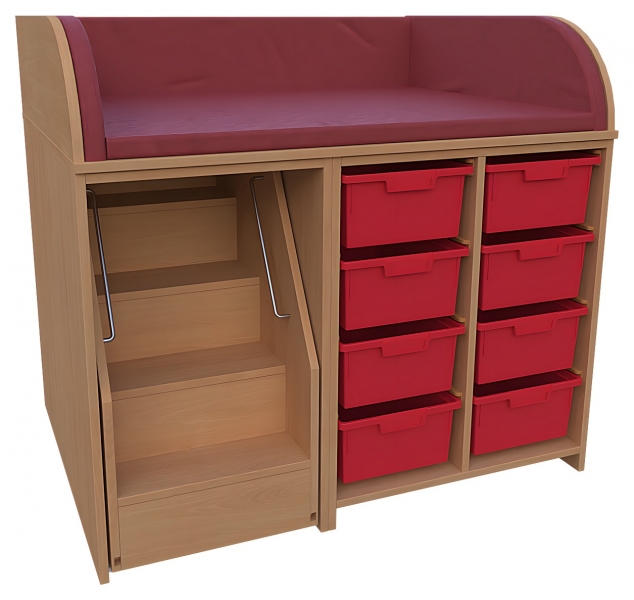 Wickelkommode, BxHxT 120 x 85 / 110 x 90 cmKorpus: 75 cm tief + Seitenteileoben: 3-seitige Aufkantung für Wickelauflage- Kunstleder Wickelauflage nicht im Lieferumfang enthaltenrechts: offen, Mittelwand, 2 x 4 hohe Kunststoffkästenauf Kunststoffschienen laufend links: 1 ausfahrbare Treppe mit Feststellstop