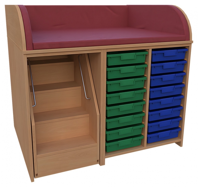 Wickelkommode, BxHxT 120 x 85 / 110 x 90 cmKorpus: 75 cm tief + Seitenteileoben: 3-seitige Aufkantung für Wickelauflage- Kunstleder Wickelauflage nicht im Lieferumfang enthaltenrechts: offen, Mittelwand, 2 x 8 flachen Kunststoffkästenauf Kunststoffschienen laufend links: 1 ausfahrbare Treppe mit Feststellstop