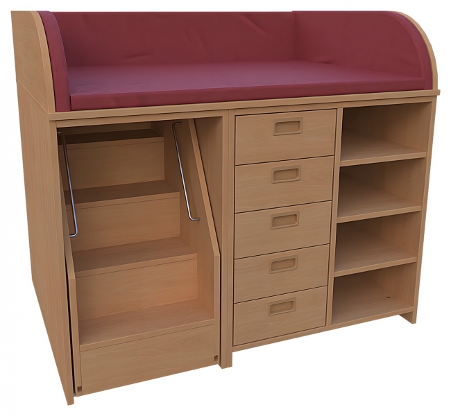 Wickelkommode, BxHxT 125 x 85 / 110 x 90 cmKorpus: 75 cm tief + Seitenteileoben: 3-seitige Aufkantung für Wickelauflage- Kunstleder Wickelauflage nicht im Lieferumfang enthaltenrechts: offen, Mittelwand, 5 Schubkästenmit SoftClode Auszügen, Muschelgriffendaneben, offen, 3 verstellbare Einlegebödenlinks: 1 ausfahrbare Treppe mit Feststellstop