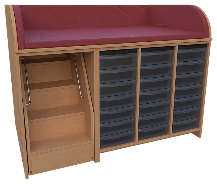 Wickelkommode, BxHxT 145 x 85 / 110 x 90 cmKorpus: 75 cm tief + Seitenteileoben: 3-seitige Aufkantung für Wickelauflage- Kunstleder Wickelauflage nicht im Lieferumfang enthaltenrechts: offen, 2 Trennwände, 3 x 7 flache Modulboxenlinks: 1 ausfahrbare Treppe mit Feststellstop