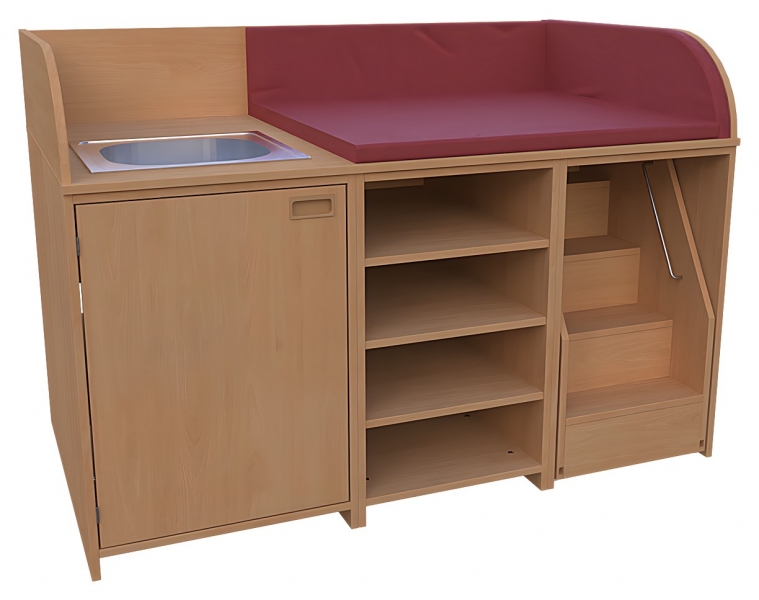 Wickelkommode, BxHxT 160 x 85 / 110 x 90 cmKorpus: 75 cm tief + Seitenteileoben: 3-seitige Aufkantung für Wickelauflage- Kunstleder Wickelauflage nicht im Lieferumfang enthaltenlinks:: 1 Waschbecken, 1 Tür, Muschelgrff, 1 Einlegebodenmitte: offen, 3 verstellbare Einlegebödenrechts: 1 ausfahrbare Treppe mit Feststellstop