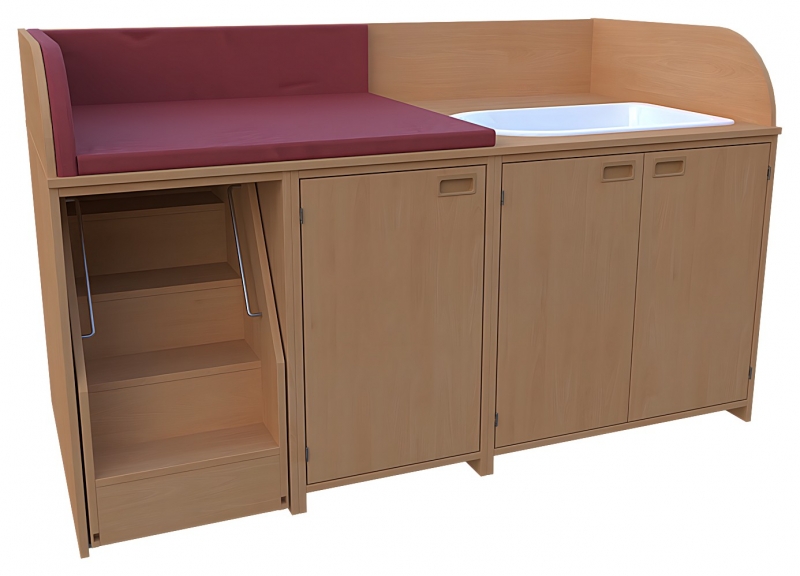 Wickelkommode, BxHxT 185 x 85 / 110 x 90 cmKorpus: 75 cm tief + Seitenteileoben: 3-seitige Aufkantung für Wickelauflage- Kunstleder Wickelauflage nicht im Lieferumfang enthaltenrechts: 1 VARICOR Badebecken, 2 Türen, Muschelgriffe, 1 Einlegebodenmitte: 1 Tür, Muschelgriff, 3 verstellbare Einlegebödenlinks: 1 ausfahrbare Treppe mit Feststellstop