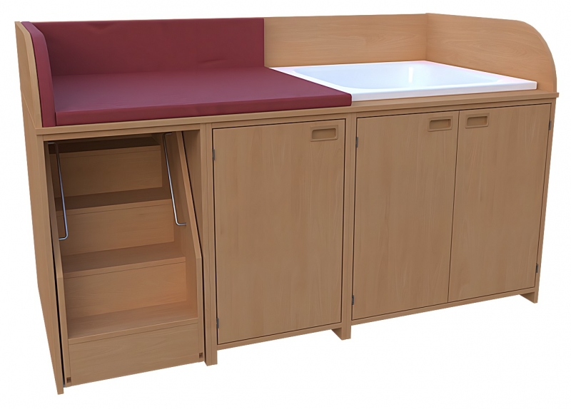 Wickelkommode, BxHxT 185 x 85 / 110 x 90 cmKorpus: 75 cm tief + Seitenteileoben: 3-seitige Aufkantung für Wickelauflage- Kunstleder Wickelauflage nicht im Lieferumfang enthaltenlinks: 1 ausfahrbare Treppe mit Feststellstopmitte: 1 Tür, Muschelgriff, 2 verstellbare Einlegebödenrechts: 1 Duschwanne 80 x 80 cm 2 Türen, Muschelgriffe, 1 verstellbarer Einlegeboden