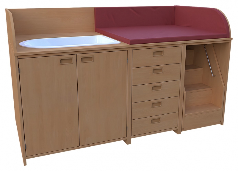 Wickelkommode, BxHxT 185 x 85 / 110 x 90 cmKorpus: 75 cm tief + Seitenteileoben: 3-seitige Aufkantung für Wickelauflage- Kunstleder Wickelauflage nicht im Lieferumfang enthaltenlinks: 1 VARICOR Badebecken, 2 Türen, Muschelgriffe, 1 Einlegebodenmitte: 5 Schubkästen, Muschelgriffe, SoftClose Auszügerechts: 1 ausfahrbare Treppe mit Feststellstop