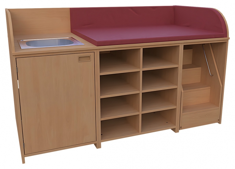 Wickelkommode, BxHxT 185 x 85 / 110 x 90 cmKorpus: 75 cm tief + Seitenteileoben: 3-seitige Aufkantung für Wickelauflage- Kunstleder Wickelauflage nicht im Lieferumfang enthaltenlinks: 1 Waschbecken, 1 Tür, 1 Einlegebodenmitte: offen, Mittelwand, 2 x 3 verstellbare Einlegebödenrechts: 1 ausfahrbare Treppe mit Feststellstop