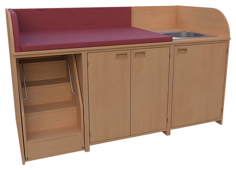 Wickelkommode, BxHxT 185 x 85 / 110 x 90 cmKorpus: 75 cm + Seitenteileoben: 3-seitige Aufkantung für Wickelauflage- Kunstleder Wickelauflage nicht im Lieferumfang enthaltenrechts: 1 Waschbecken, 1 Tür, 1 Einlegebodenmitte: 2 Türen, Muschelgriff, 3 verstellbare Einlegebödenlinks: 1 ausfahrbare Treppe mit Feststellstop