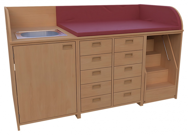 Wickelkommode, BxHxT 185 x 85 / 110 x 90 cmKorpus: 75 cm tief + Seitenteileoben: 3-seitige Aufkantung für Wickelauflage- Kunstleder Wickelauflage nicht im Lieferumfang enthaltenlinks: 1 Waschbecken, 1 Tür, 1 Einlegebodenmitte: offen, Mittelwand, 2 x 5 Schubkästen, Muschelgriffe, SoftClose Auszügerechts: 1 ausfahrbare Treppe mit Feststellstop
