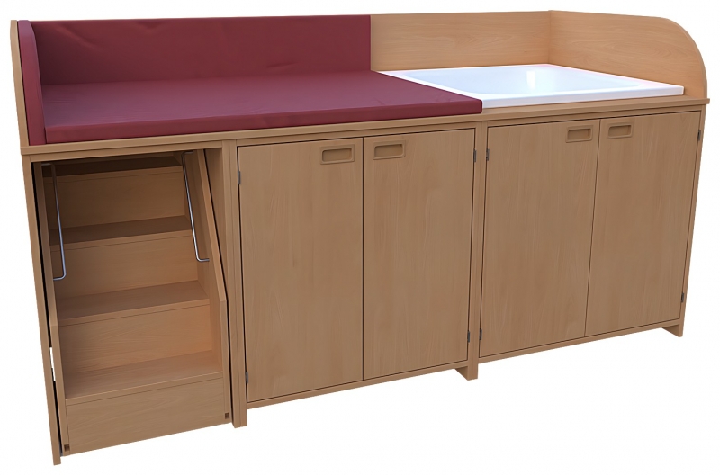 Wickelkommode, BxHxT 210 x 85 / 110 x 90 cmKorpus: 75 cm tief + Seitenteileoben: 3-seitige Aufkantung für Wickelauflage- Kunstleder Wickelauflage nicht im Lieferumfang enthaltenlinks: 1 ausfahrbare Treppe mit Feststellstopmitte: 2 Türen, Muschelgriffe, 2 verstellbare Einlegebödenrechts: 1 Duschwanne 80 x 80 cm 2 Türen, Muschelgriffe, 1 verstellbarer Einlegeboden