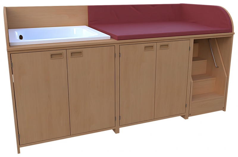 Wickelkommode, BxHxT 210 x 85 / 110 x 90 cmKorpus: 75 cm tief + Seitenteileoben: 3-seitige Aufkantung für Wickelauflage- Kunstleder Wickelauflage nicht im Lieferumfang enthaltenrechts: 1 ausfahrbare Treppe mit Feststellstopmitte: 2 Türen, Muschelgriffe, 2 verstellbare Einlegebödenlinks: 1 Duschwanne 80 x 80 cm 2 Türen, Muschelgriffe, 1 verstellbarer Einlegeboden