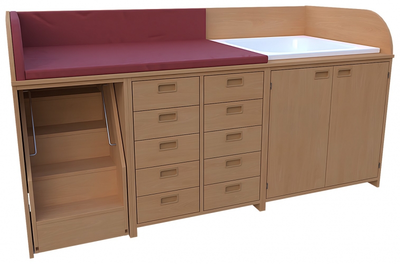 Wickelkommode, BxHxT 210 x 85 / 110 x 90 cmKorpus: 75 cm tief + Seitenteileoben: 3-seitige Aufkantung für Wickelauflage- Kunstleder Wickelauflage nicht im Lieferumfang enthaltenlinks: 1 ausfahrbare Treppe mit Feststellstopmitte: offen, Mittelwand, 2 x 5 SchubkästenMuschelgriffe, SoftClose Auszüge rechts: 1 Duschwanne 80 x 80 cm 2 Türen, Muschelgriffe, 1 verstellbarer Einlegeboden