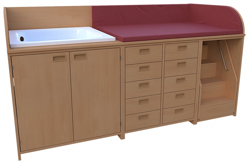 Wickelkommode, BxHxT 210 x 85 / 110 x 90 cmKorpus: 75 cm tief + Seitenteileoben: 3-seitige Aufkantung für Wickelauflage- Kunstleder Wickelauflage nicht im Lieferumfang enthaltenrechts: 1 ausfahrbare Treppe mit Feststellstopmittel: offen, Mittelwand, 2 x 5 SchubkästenMuschelgriffe, SoftClose Auszüge links: 1 Duschwanne 80 x 80 cm 2 Türen, Muschelgriffe, 1 verstellbarer Einlegeboden