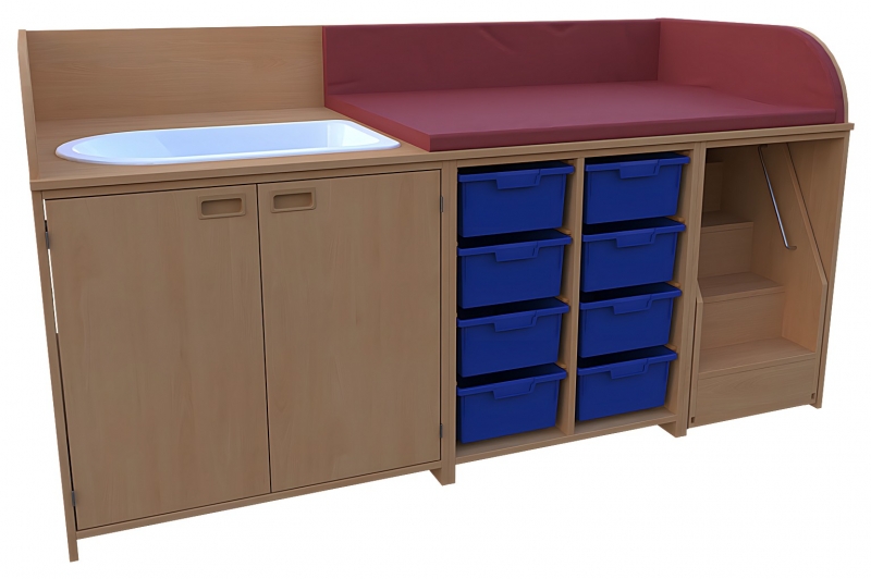Wickelkommode, BxHxT 210 x 85 / 110 x 90 cmKorpus: 75 cm tief + Seitenteileoben: 3-seitige Aufkantung für Wickelauflage- Kunstleder Wickelauflage nicht im Lieferumfang enthaltenlinks: 1 VARICOR Badebecken, 2 Türen, Muschelgriffe, 1 Einlegebodenmitte: offen, Mittelwand, 2 x 4 hohe Kunststoffkästenauf Kunststoffschienen laufend rechts: 1 ausfahrbare Treppe mit Feststellstop