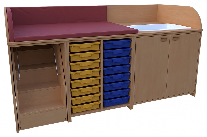 Wickelkommode, BxHxT 210 x 85 / 110 x 90 cmKorpus: 75 cm tief + Seitenteileoben: 3-seitige Aufkantung für Wickelauflage- Kunstleder Wickelauflage nicht im Lieferumfang enthaltenrechts: 1 VARICOR Badebecken, 2 Türen, Muschelgriffe, 1 Einlegebodenmitte: offen, Mittelwand, 2 x 8 flachen Kunststoffkästenauf Kunststoffschienen laufend links: 1 ausfahrbare Treppe mit Feststellstop