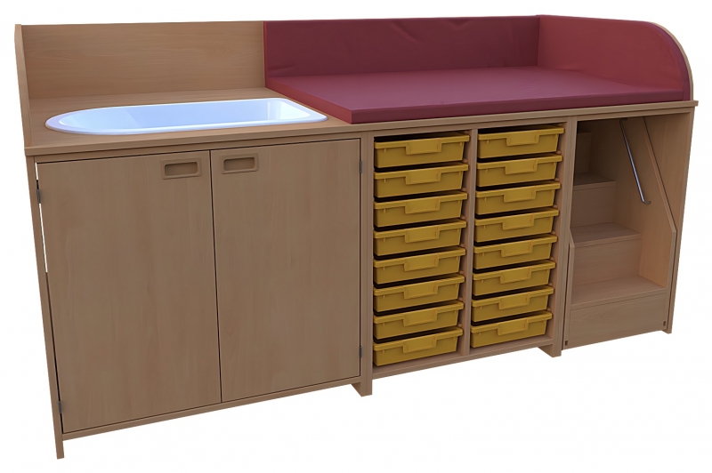 Wickelkommode, BxHxT 210 x 85 / 110 x 90 cmKorpus: 75 cm tief + Seitenteileoben: 3-seitige Aufkantung für Wickelauflage- Kunstleder Wickelauflage nicht im Lieferumfang enthaltenlinks: 1 VARICOR Badebecken, 2 Türen, Muschelgriffe, 1 Einlegebodenmitte: offen, Mittelwand, 2 x 8 flachen Kunststoffkästenauf Kunststoffschienen laufend rechts: 1 ausfahrbare Treppe mit Feststellstop