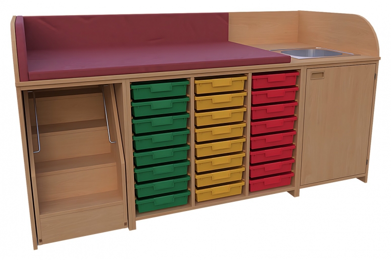 Wickelkommode, BxHxT 210 x 85 / 110 x 90 cmKorpus: 75 cm tief + Seitenteileoben: 3-seitige Aufkantung für Wickelauflage- Kunstleder Wickelauflage nicht im Lieferumfang enthaltenrechts: 1 Waschbecken, 1 Tür, 1 Einlegebodenmitte: offen, 2 Trennwände, 3 x 8 flachen Kunststoffkästenauf Kunststoffschienen laufend links: 1 ausfahrbare Treppe mit Feststellstop