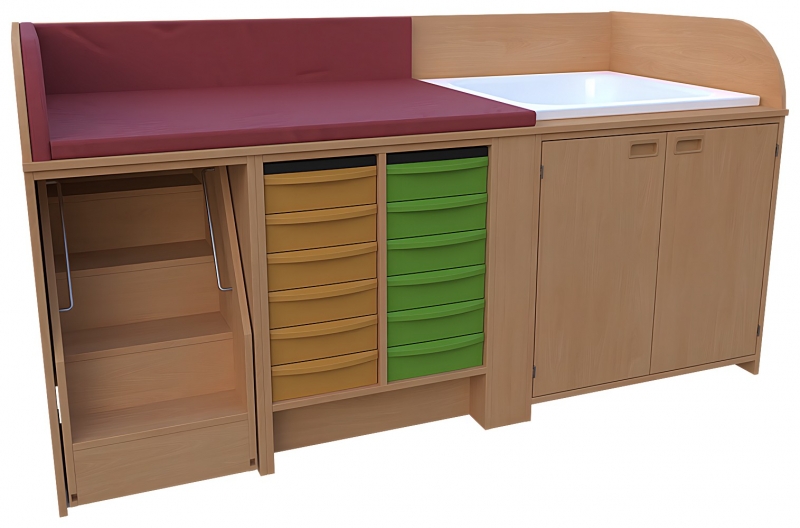 Wickelkommode, BxHxT 210 x 85 / 110 x 90 cmKorpus: 75 cm tief + Seitenteileoben: 3-seitige Aufkantung für Wickelauflage- Kunstleder Wickelauflage nicht im Lieferumfang enthaltenlinks: 1 ausfahrbare Treppe mit Feststellstopmittel: offen, Mittelwand, 2 x 3 hohen Modulboxenrechts: 1 Duschwanne 80 x 80 cm 2 Türen, Muschelgriffe, 1 verstellbarer Einlegeboden