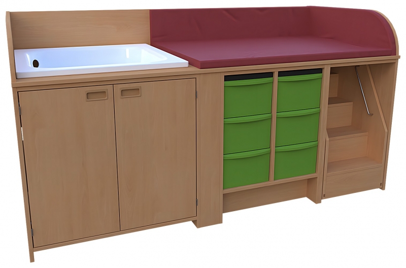 Wickelkommode, BxHxT 210 x 85 / 110 x 90 cmKorpus: 75 cm tief + Seitenteileoben: 3-seitige Aufkantung für Wickelauflage- Kunstleder Wickelauflage nicht im Lieferumfang enthaltenrechts: 1 ausfahrbare Treppe mit Feststellstopmitte: offen, Mittelwand, 2 x 3 hohen Modulboxenlinks: 1 Duschwanne 80 x 80 cm 2 Türen, Muschelgriffe, 1 verstellbarer Einlegeboden