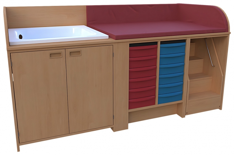 Wickelkommode, BxHxT 210 x 85 / 110 x 90 cmKorpus: 75 cm tief + Seitenteileoben: 3-seitige Aufkantung für Wickelauflage- Kunstleder Wickelauflage nicht im Lieferumfang enthaltenrechts: 1 ausfahrbare Treppe mit Feststellstopmitte: offen, Mittelwand, 2 x 6 flachen Modulboxenlinks: 1 Duschwanne 80 x 80 cm 2 Türen, Muschelgriffe, 1 verstellbarer Einlegeboden