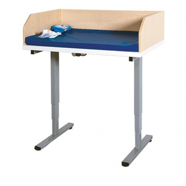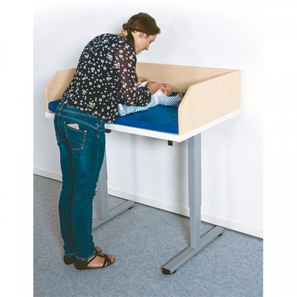 Der praktische, elektrisch höhenverstellbare Wickeltisch lässt sich mittels Auf/Ab-Schalter stufenlos verstellen, bis eine rückenschonende Arbeitshöhe erreicht ist. Dreiseitige Sicherheits-Aufkantungen umranden die Arbeitsplatte, welche wasserfest beschichtet und vorn benutzerfreundlich gerundet ist. Es kann zwischen zwei verschiedenen Arbeitstiefen gewählt werden. Die Wickelauflage ist separat zu bestellen.