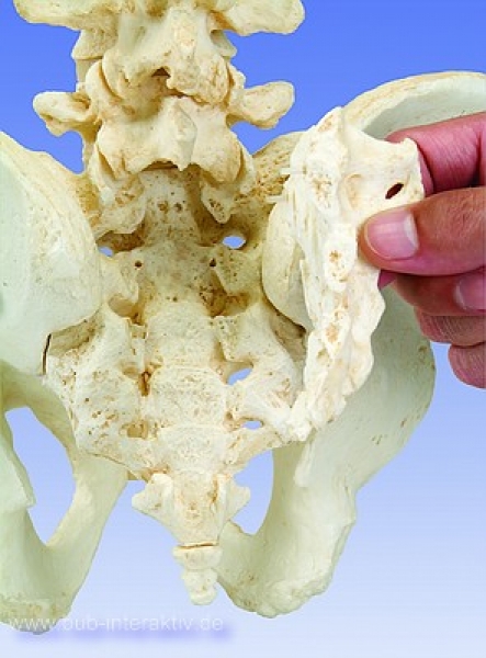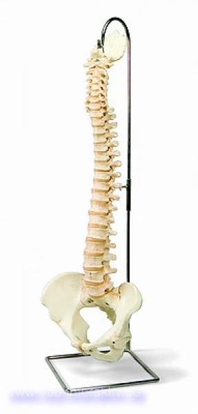 Flexibel montierte Abformung der menschlichen Wirbelsäule in hervorragender BONElikeTM Qualität mit originalgetreuer Wiedergabe aller anatomischen Details und realem Gewicht. Mit männlichem Becken und Hinterhauptschuppe. Hinterhauptschuppe und Atlas sind einzeln abnehmbar. Ohne Stativ, siehe A59/8.