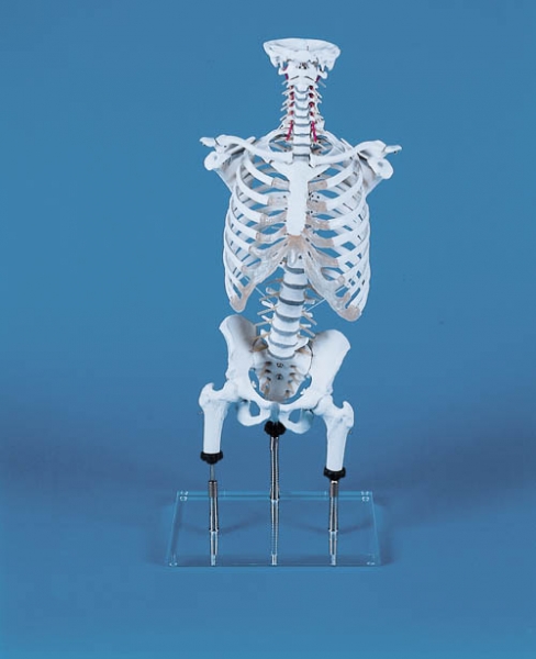 Speziell entworfen für Zilgrei Ausbildung, aber auch geeignet für Physiotherapie, Massage und Musiklehranstalten (Sänger, Bläser) sowie für die Orthopädie. An diesem Modell können Oberschenkelbewegungen im Hüftgelenk imitiert werden. Die Oberschenkel können jeweils gehoben und gesenkt werden, so dass einseitige Beinverkürzungen und ein daraus resultierender Beckenschiefstand simuliert werden kann. Am Modell kann gezeigt werden, wie dies am Becken und an der Wirbelsäule kompensiert wird. Die Montage des Brustkorbs (Thorax) mit Schultergürtel erlaubt, die Kombination der Bewegungen der Wirbelsäule und des Brustkorbs. Bei der Atmung und bei Atemgymnastik kann demonstriert werden, wie sich der Brustkorb beim Aus- und Einatmen hebt und senkt. Die komplette Wirbelsäule ist leicht vom Stativ abnehmbar. Größe: 78 cm, Gewicht: 5,4 kg