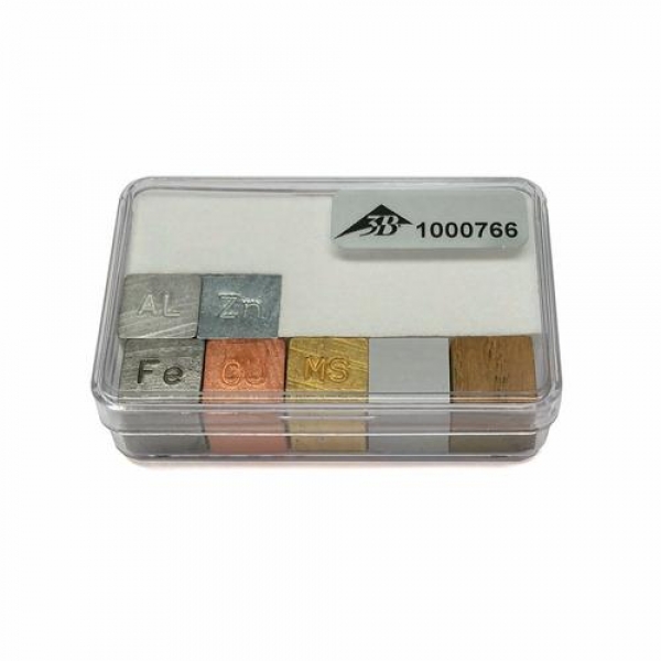 Satz sieben Würfel unterschiedlichen Materials zur Dichtebestimmung durch Wägung. In Aufbewahrungskästchen.