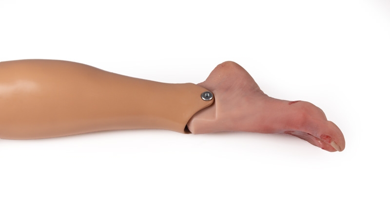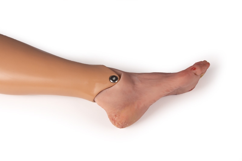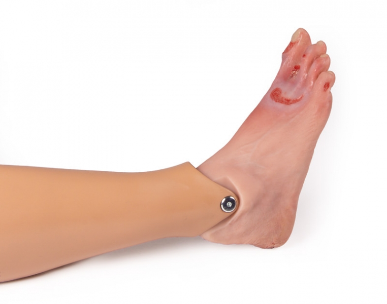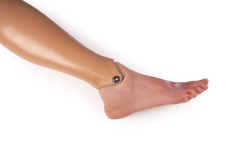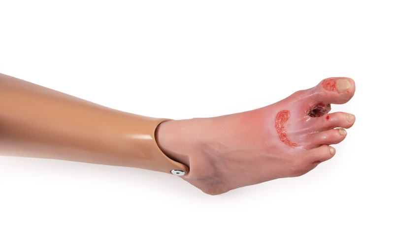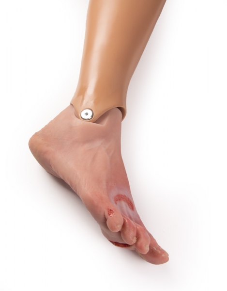 Dieser lebensgroße Fuß mit diabetischem Fußsyndrom zeigt den Fuß nach erfolgter Strahlresektion als Folge der Nekrose und des tiefen Ulkus. Zusätzlich sind weitere Ulzera, Läsionen sowie rissige Haut dargestellt. Das ideale Modell für die Ausbildung im Wundmanagement und in der allgemeinen Pflege.