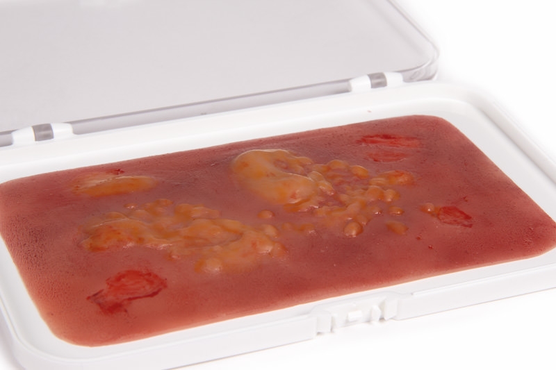 Die Moulage haftet selbständig an Simulationspatienten oder Puppen, kann aber für eine länger dauernde Übung auch mit speziellem Hautkleber befestigt werden.
