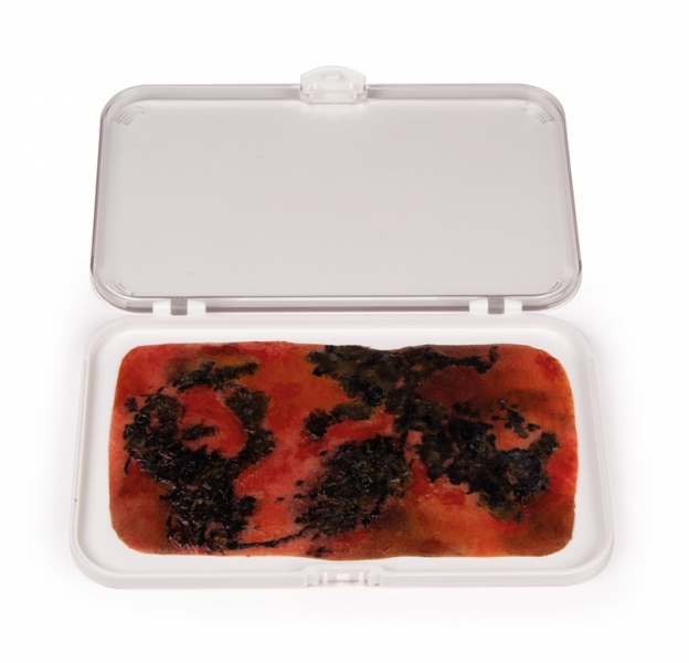 Diese Moulage zeigt eine Verbrennung 3en Grades mit verbrannter Hautschicht. Die Moulage haftet selbständig an Simulationspatienten oder Puppen, kann aber für eine länger dauernde Übung auch mit speziellem Hautkleber befestigt werden.
