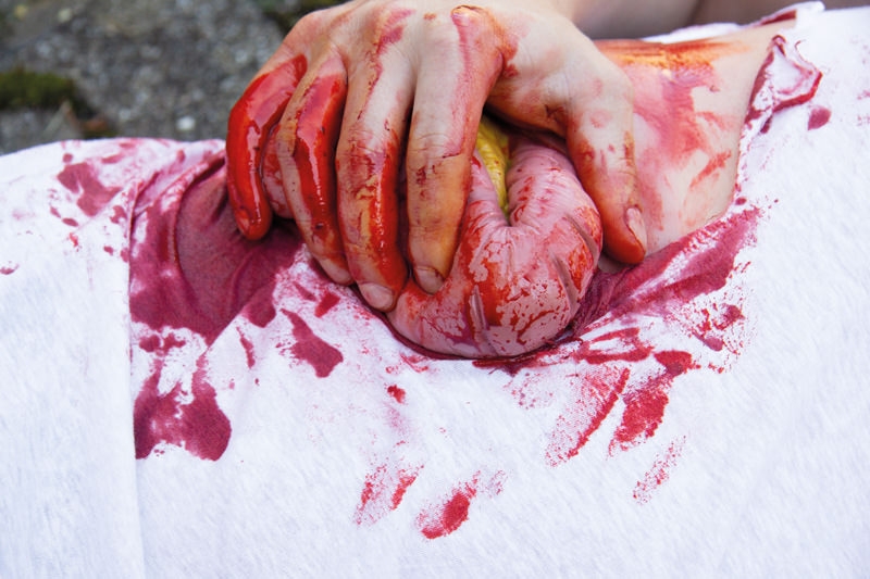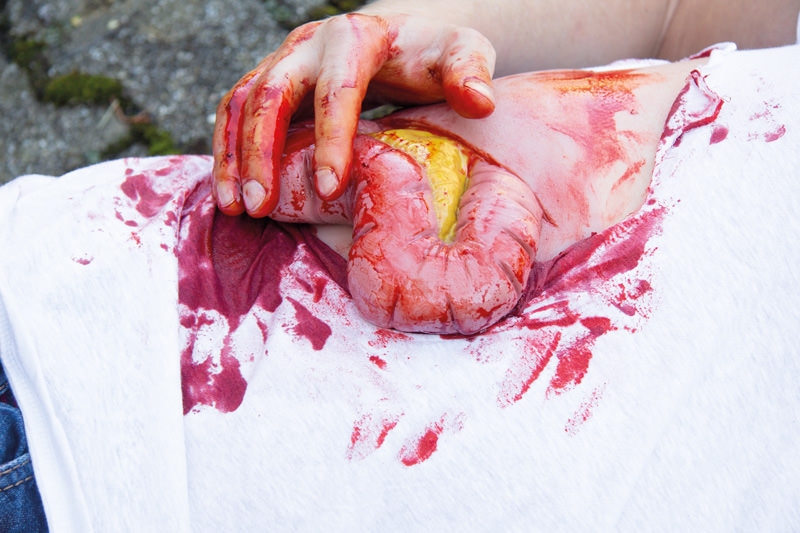 Diese Moulage zeigt einen austretenden Dickdarm nach Verletzung der Bauchdecke. Die Moulage haftet selbständig an Simulationspatienten oder Puppen, kann aber für eine länger dauernde Übung auch mit speziellem Hautkleber befestigt werden.