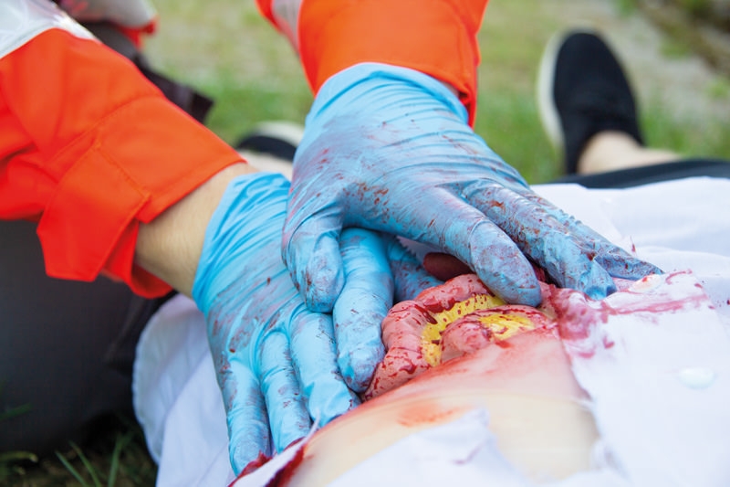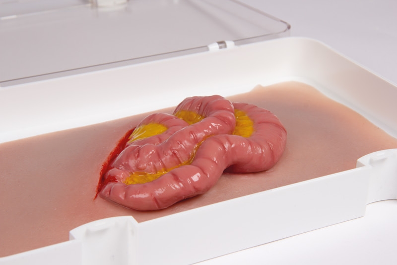 Diese Moulage zeigt einen austretenden Dünndarm nach Verletzung der Bauchdecke. Die Moulage haftet selbständig an Simulationspatienten oder Puppen, kann aber für eine länger dauernde Übung auch mit speziellem Hautkleber befestigt werden.