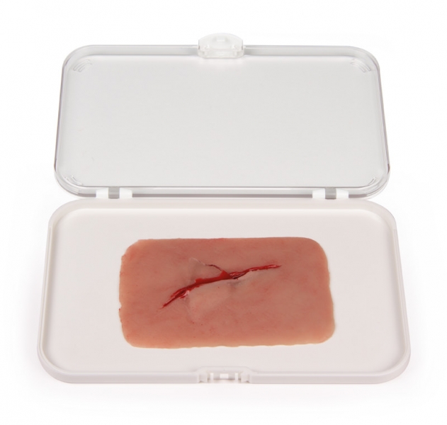 Diese Moulage zeigt eine Schnittverletzung durch einen Glassplitter, wobei der Glassplitter in der Wunde verblieben ist. Der Glassplitter sieht realistisch aus, ist jedoch aus einem weichen Material gefertigt, so dass keine Verletzungsgefahr besteht. Die Moulage haftet selbständig an Simulationspatienten oder Puppen, kann aber für eine länger dauernde Übung auch mit speziellem Hautkleber befestigt werden.
