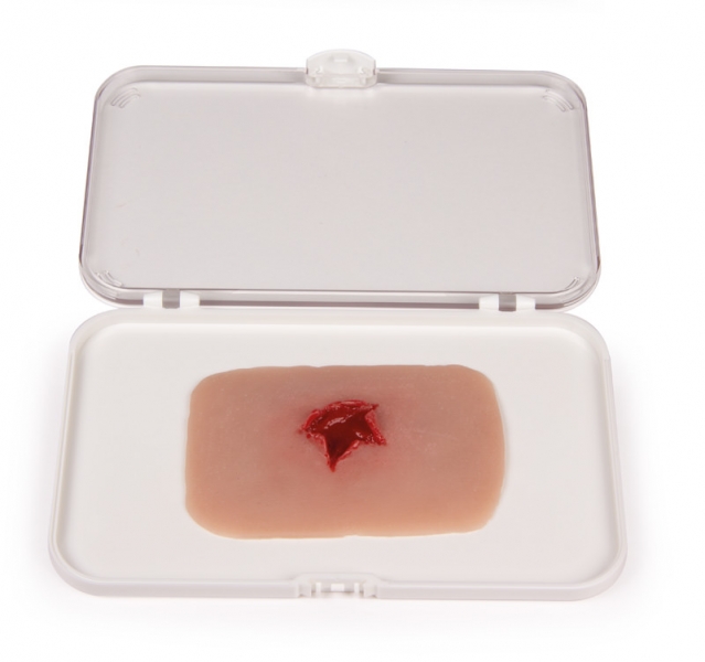 Die Moulage haftet selbständig an Simulationspatienten oder Puppen, kann aber für eine länger dauernde Übung auch mit speziellem Hautkleber befestigt werden.