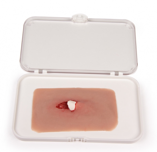 Diese Moulage zeigt einen offenen Knochenbruch eines kleineren Knochens (z.B. Unterarm). Die Moulage haftet selbständig an Simulationspatienten oder Puppen, kann aber für eine länger dauernde Übung auch mit speziellem Hautkleber befestigt werden.