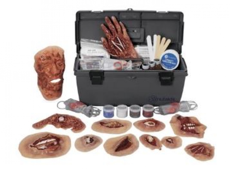 Dieses Trauma-Moulageset stellt Wunden durch Explosionen und chemische Katastrophen dar. Die simulierten Traumawunden unterstützen das Training von militärischen und regierungsbehördlichen Ersthelfern und allen, die Verletzte in Katastrophen und Kriegssituationen versorgen.