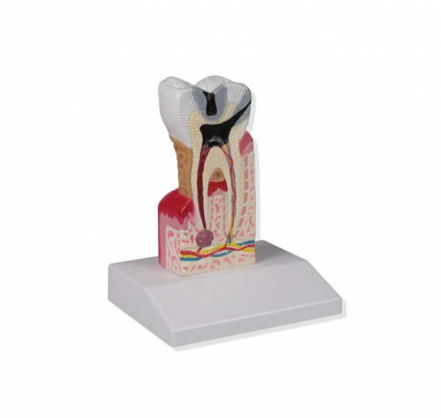 Unterer Molar mit Darstellung von Karies, Pulpaentzündung und Wurzelspitzenentzündung.
